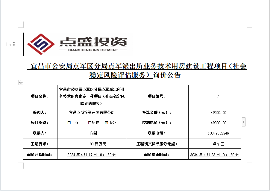 宜昌市公安局點(diǎn)軍區(qū)分局點(diǎn)軍派出所業(yè)務(wù)技術(shù)用房建設(shè)工程項目(社會穩(wěn)定風(fēng)險評估服務(wù))詢價公告