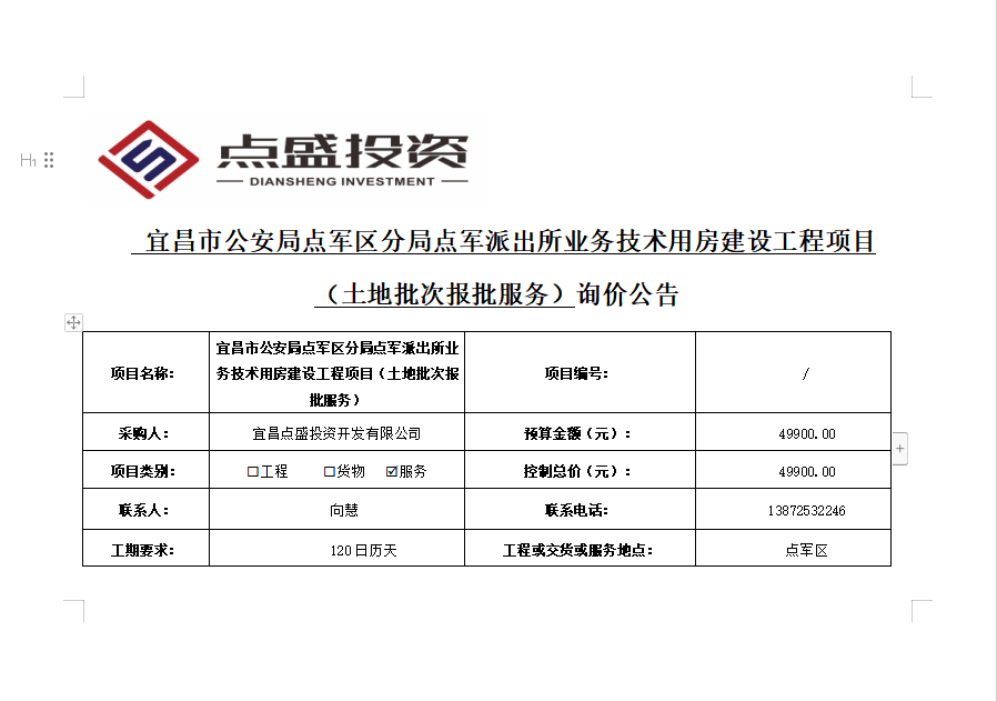 宜昌市公安局點軍區(qū)分局點軍派出所業(yè)務技術用房建設工程項目 (土地批次報批服務)詢價公告