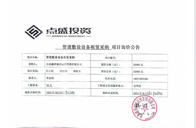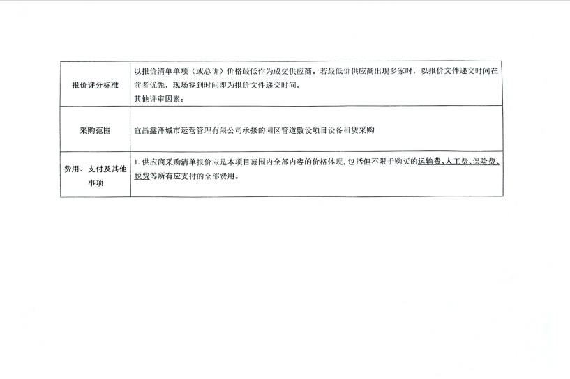 宜昌鑫澤城市運(yùn)營(yíng)管理有限公司管道敷設(shè)設(shè)備租賃采購(gòu)項(xiàng)目詢價(jià)公告