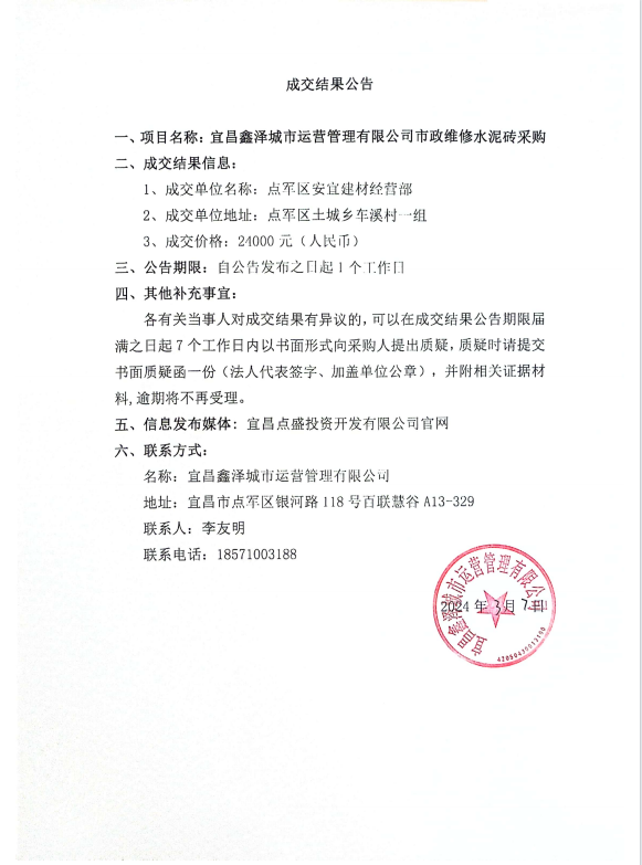 宜昌鑫澤城市運(yùn)營管理有限公司市政維修水泥磚采購項目成交公告