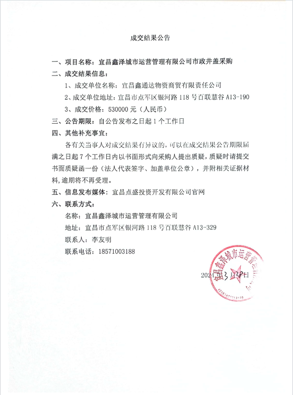宜昌鑫澤城市運(yùn)營(yíng)管理有限公司市政井蓋采購(gòu)項(xiàng)目成交公告