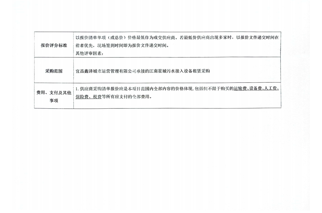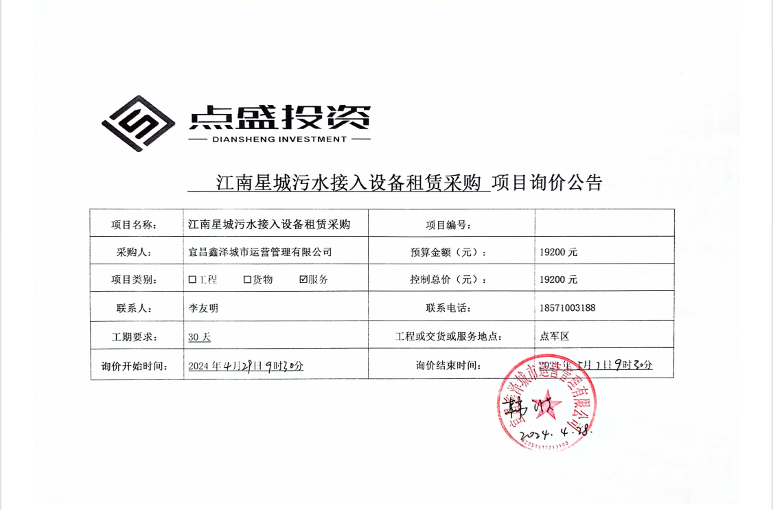 江南星城污水接入設(shè)備租賃采購詢價公告