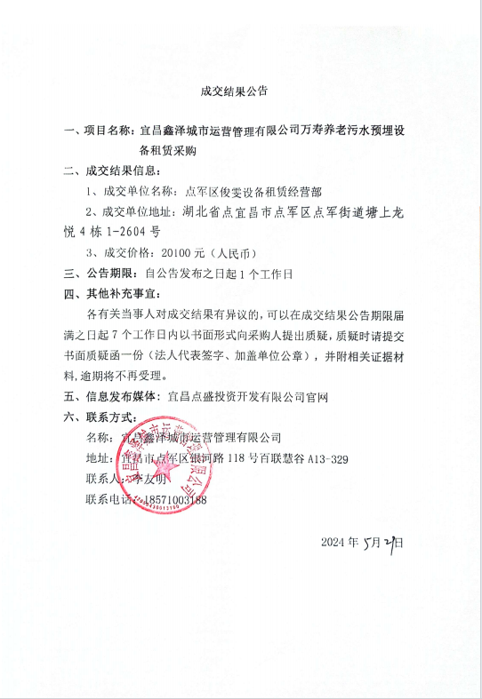 萬壽養(yǎng)老污水預埋設備租賃采購成交公告