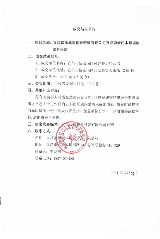 萬(wàn)壽養(yǎng)老污水預(yù)埋波紋管采購(gòu)成交公告