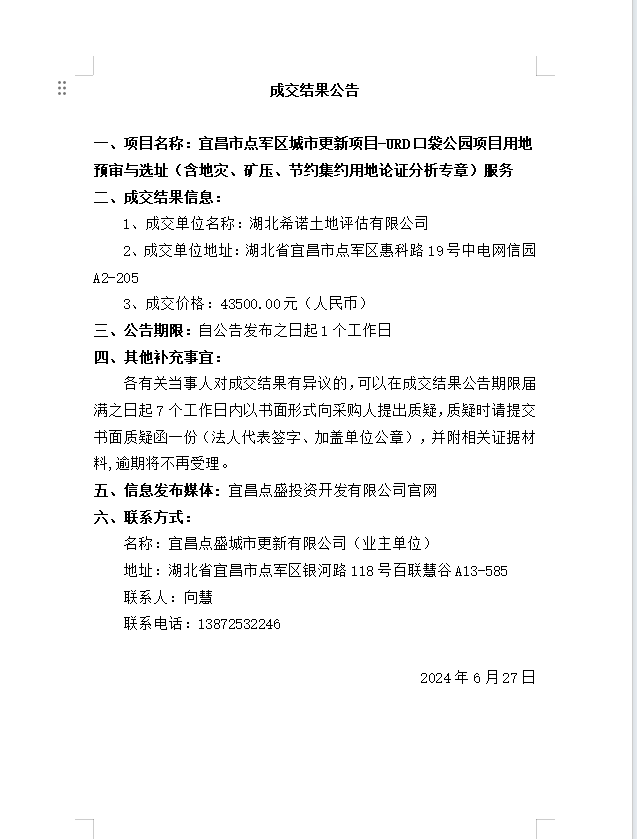 宜昌市點(diǎn)軍區(qū)城市更新項(xiàng)目-URD口袋公園項(xiàng)目用地預(yù)審與選址(含地災(zāi)、礦壓、節(jié)約集約用地論證分析專章)服務(wù) 成交公告