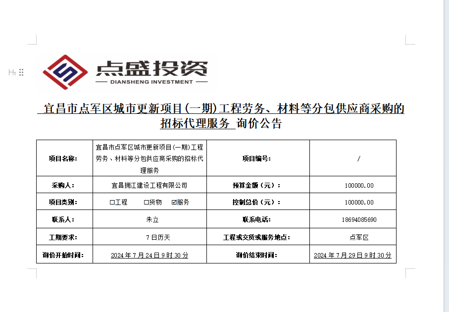 宜昌市點(diǎn)軍區(qū)城市更新項(xiàng)目(一期)工程勞務(wù)、材料等分包供應(yīng)商采購(gòu)的招標(biāo)代理服務(wù)詢價(jià)公告