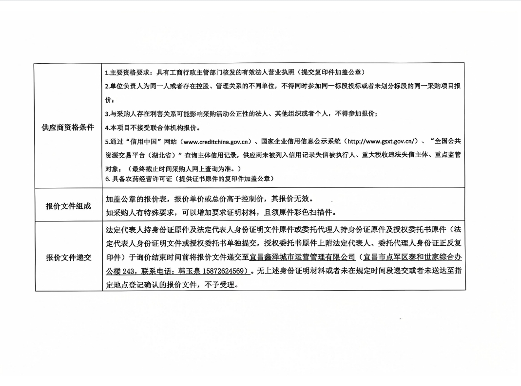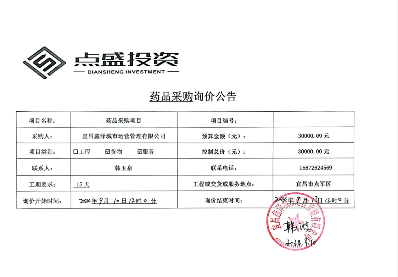 宜昌鑫澤城市運(yùn)營(yíng)管理有限公司藥品采購(gòu)項(xiàng)目詢價(jià)公告