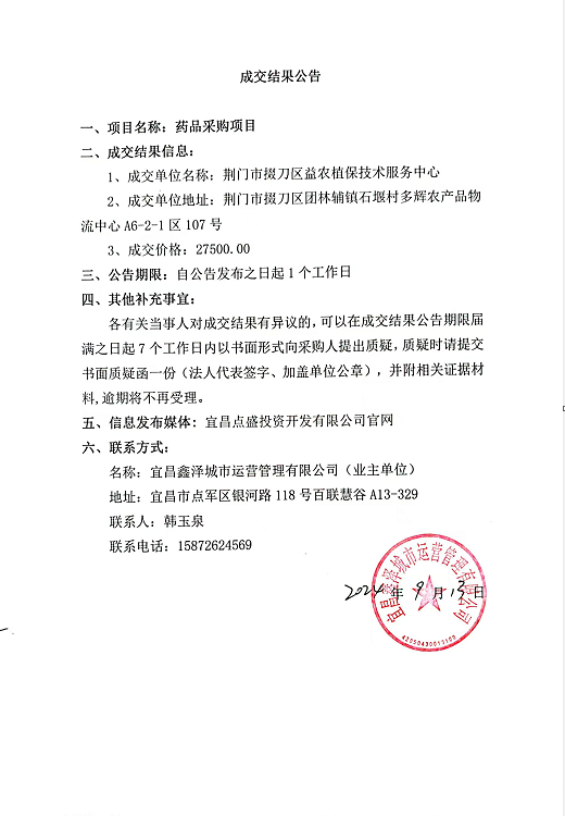宜昌鑫澤城市運(yùn)營(yíng)管理有限公司藥品采購(gòu)項(xiàng)目成交公告
