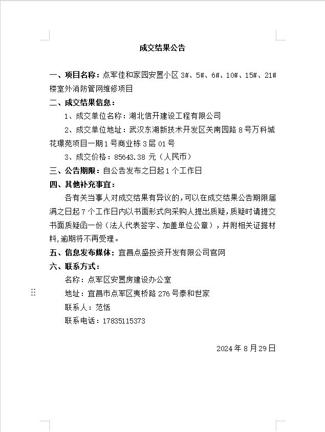 點軍佳和家園安置小區(qū)3#、5#、6#、10#、15#、21#樓室外消防管網(wǎng)維修項目成交公告
