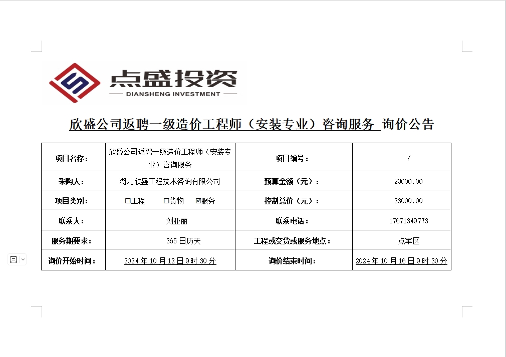 欣盛公司返聘一級造價工程師(安裝專業(yè))咨詢服務(wù)詢價公告