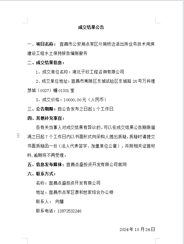 宜昌市公安局點軍區(qū)分局橋邊派出所業(yè)務技術用房建設工程水土保持報告編制服務成交公告