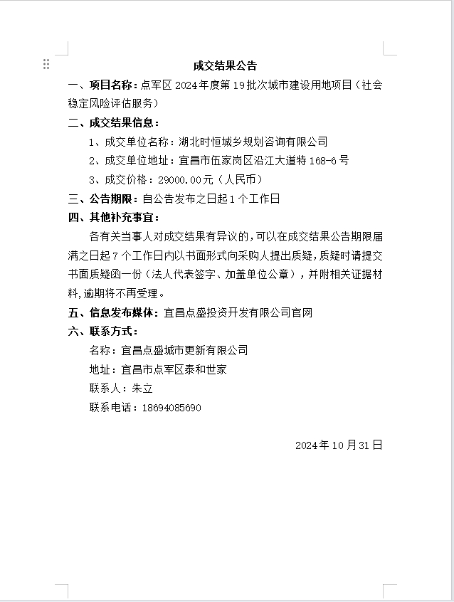 點軍區(qū)2024年度第19批次城市建設(shè)用地項目(社會穩(wěn)定風(fēng)險評估服務(wù))成交公告
