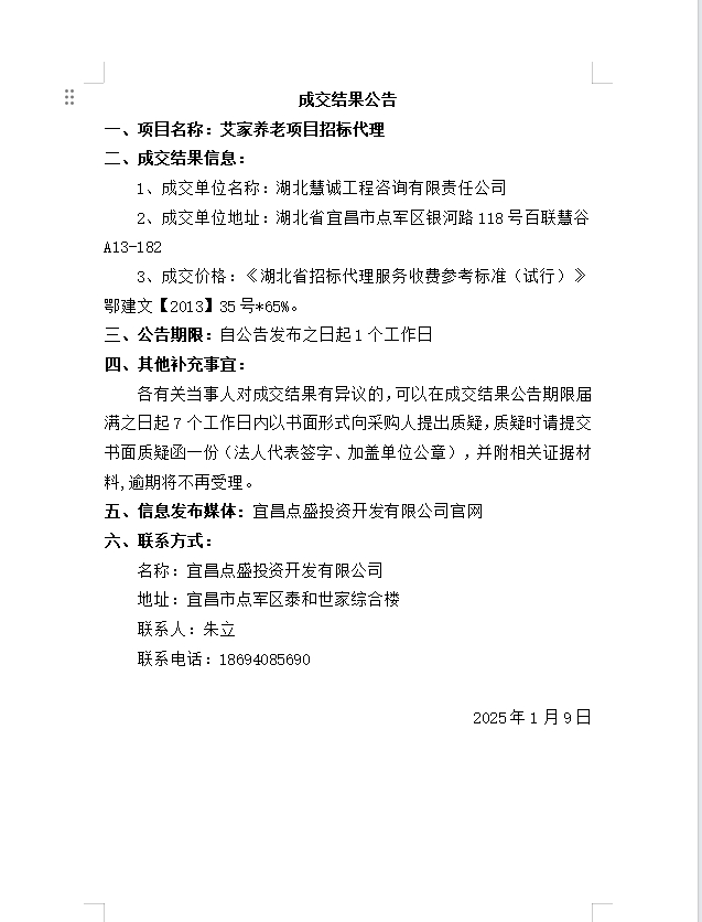 艾家養(yǎng)老項目招標(biāo)代理成交公告